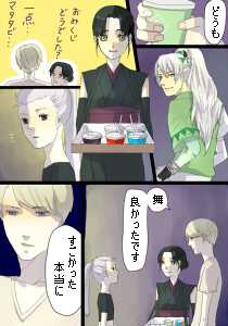 あと1コマ目が舞前、ラストコマで舞後をイメージしてはいたんですけれども、実際のところそういうイメージでよいものかと迷って曖昧な表現に留めておきました(笑)「いやこれ舞台照明だから!朝日とかじゃないから!」って言い訳できるように(笑)時間帯としては明け方というよりも日の出くらいでいいのかな…