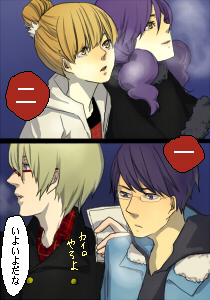 制限時間ぎりぎりまで作業してなんとか投下までこぎつけはしましたが、流れまでは直せず…裕次郎君をねじ込む形になってしまって本当に申し訳ないです。どうしても最後のコマに入れられず、それも心残りです。ムキィ!次こそは!次こそは!でも眼鏡ズを1コマ目に揃えられたのはよかったです。
